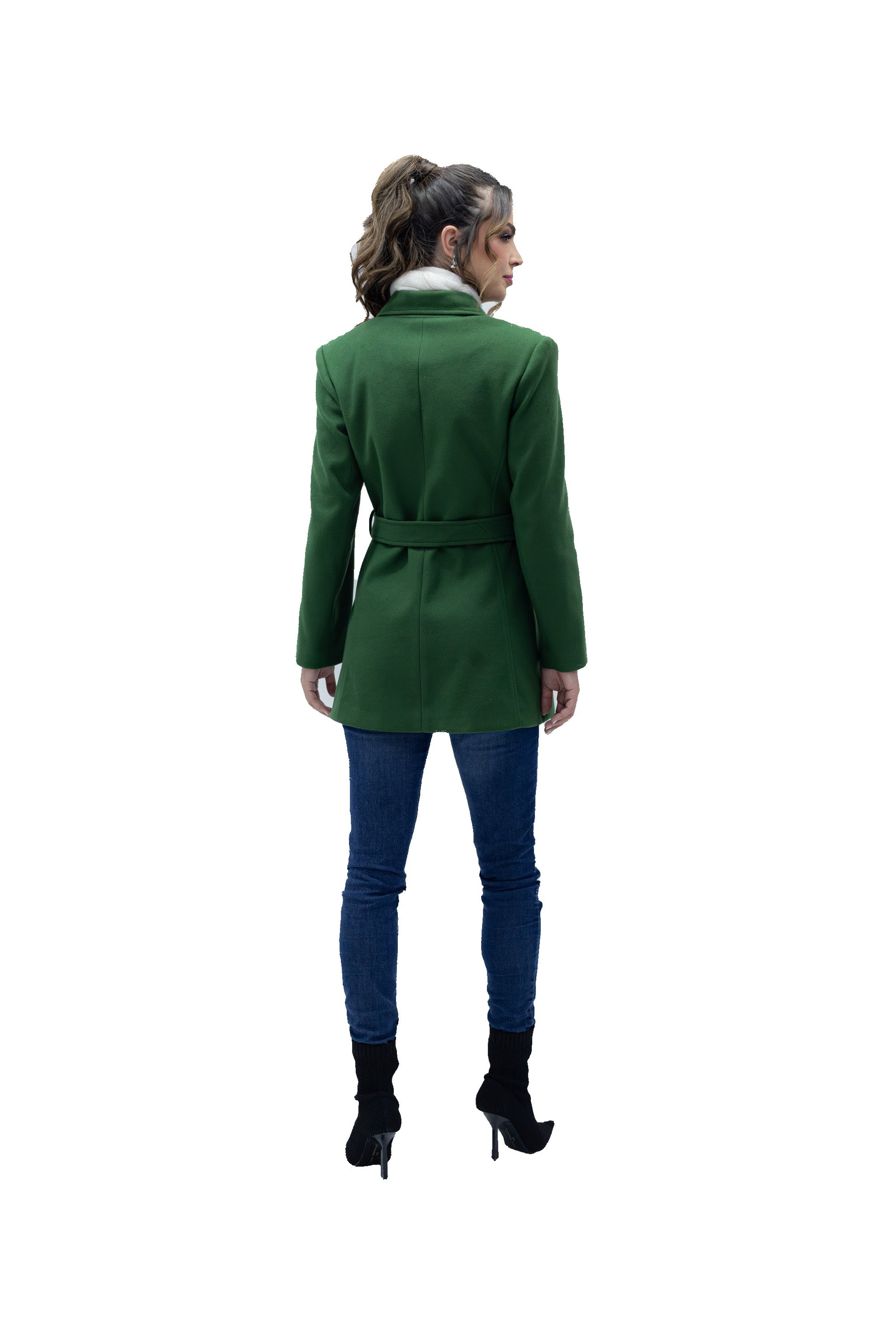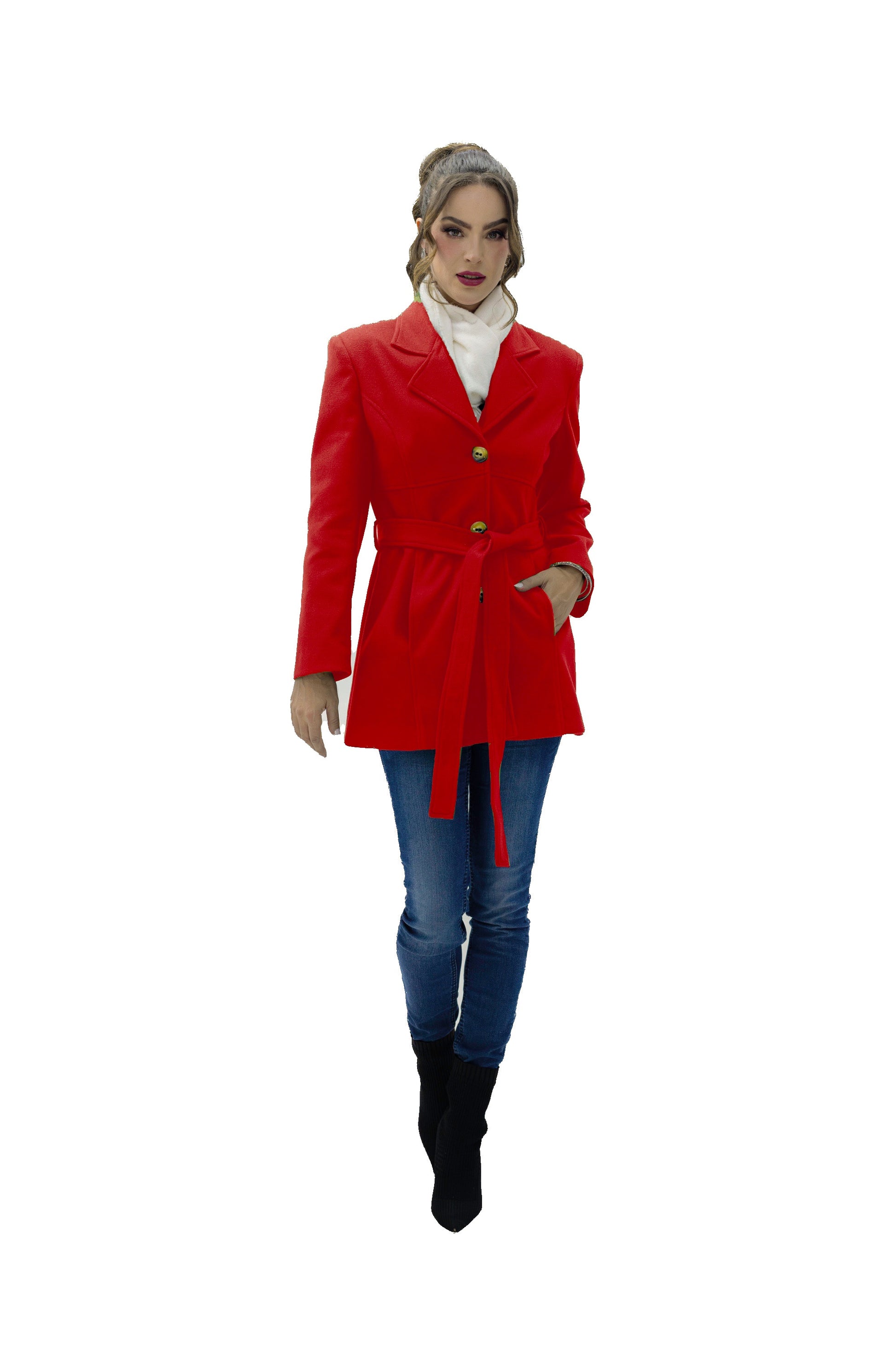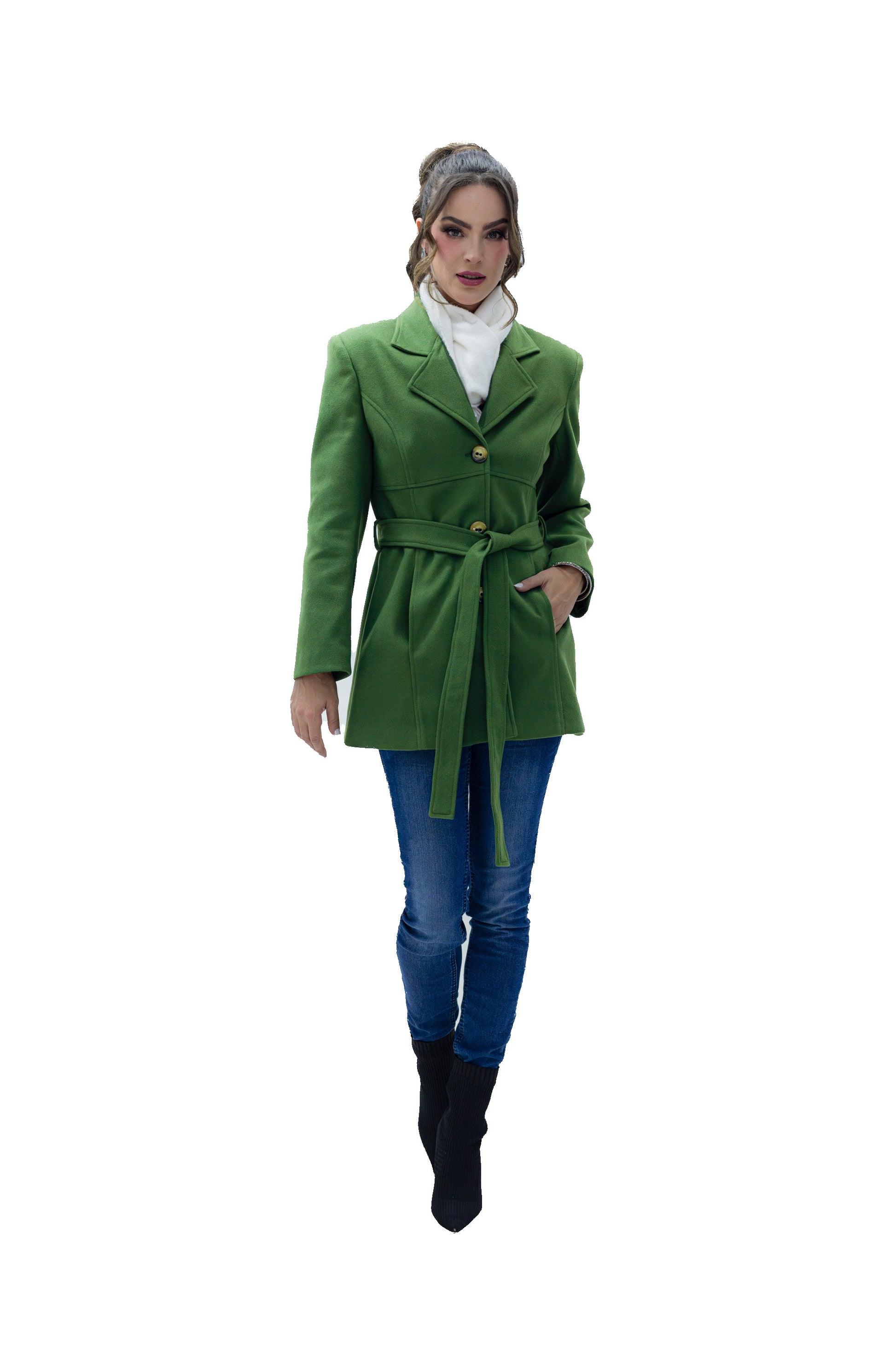 Abrigo 3/4 con cuello de solapa, tres botones al frente para cerrar y una cinta en medio para ajustar al talle de el cuerpo. Bolsillos laterales, silueta estructurada.