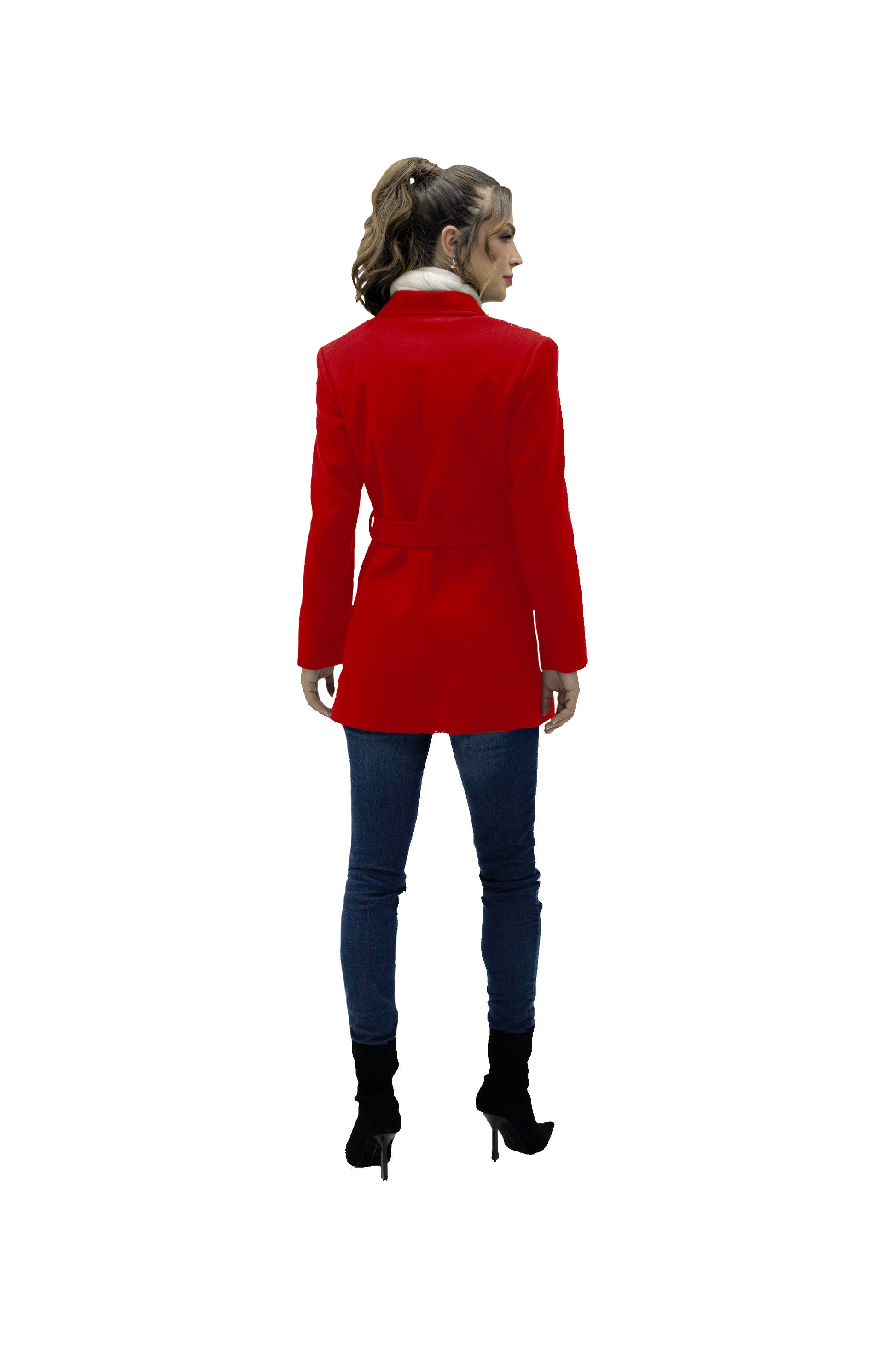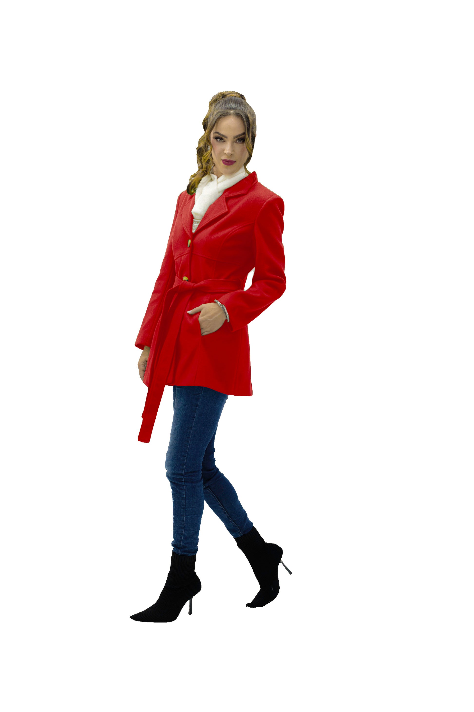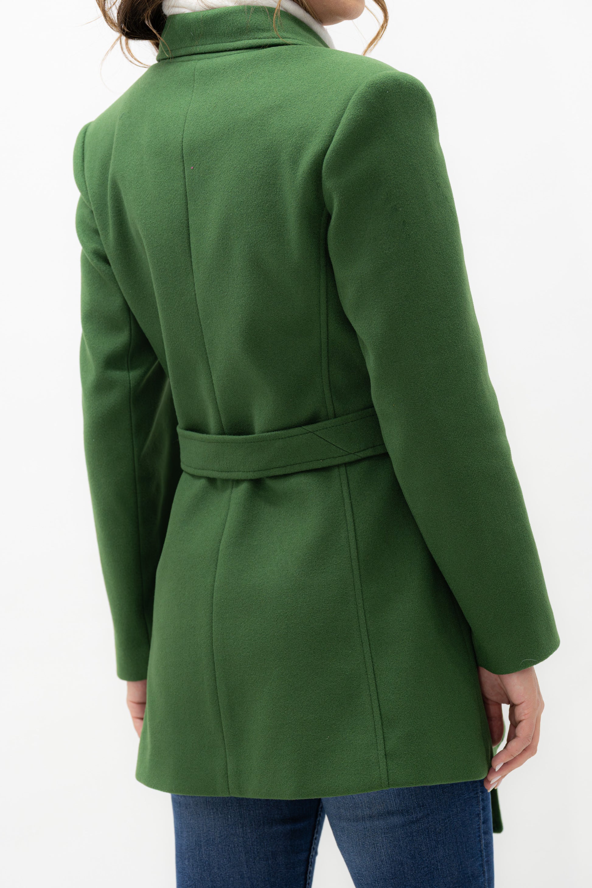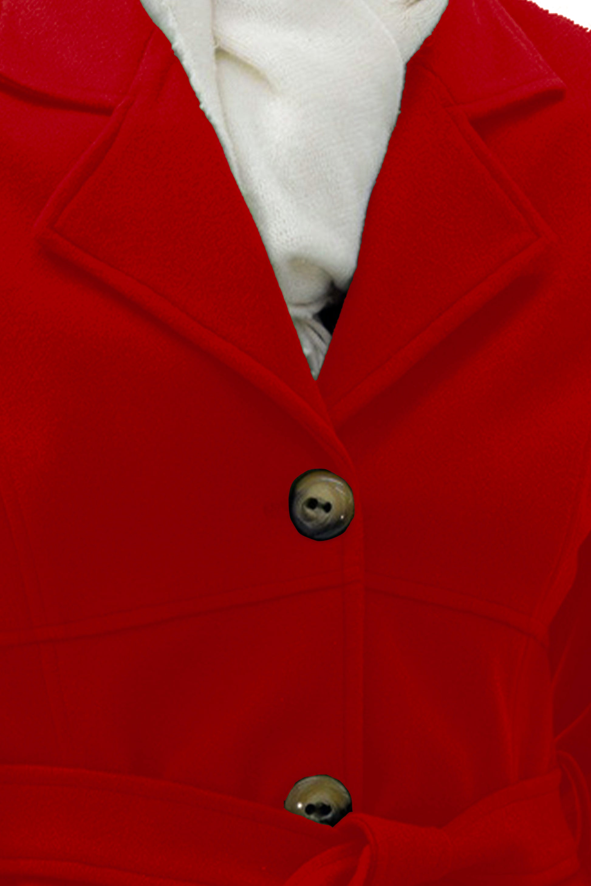 Abrigo 3/4 con cuello de solapa, tres botones al frente para cerrar y una cinta en medio para ajustar al talle de el cuerpo. Bolsillos laterales, silueta estructurada.