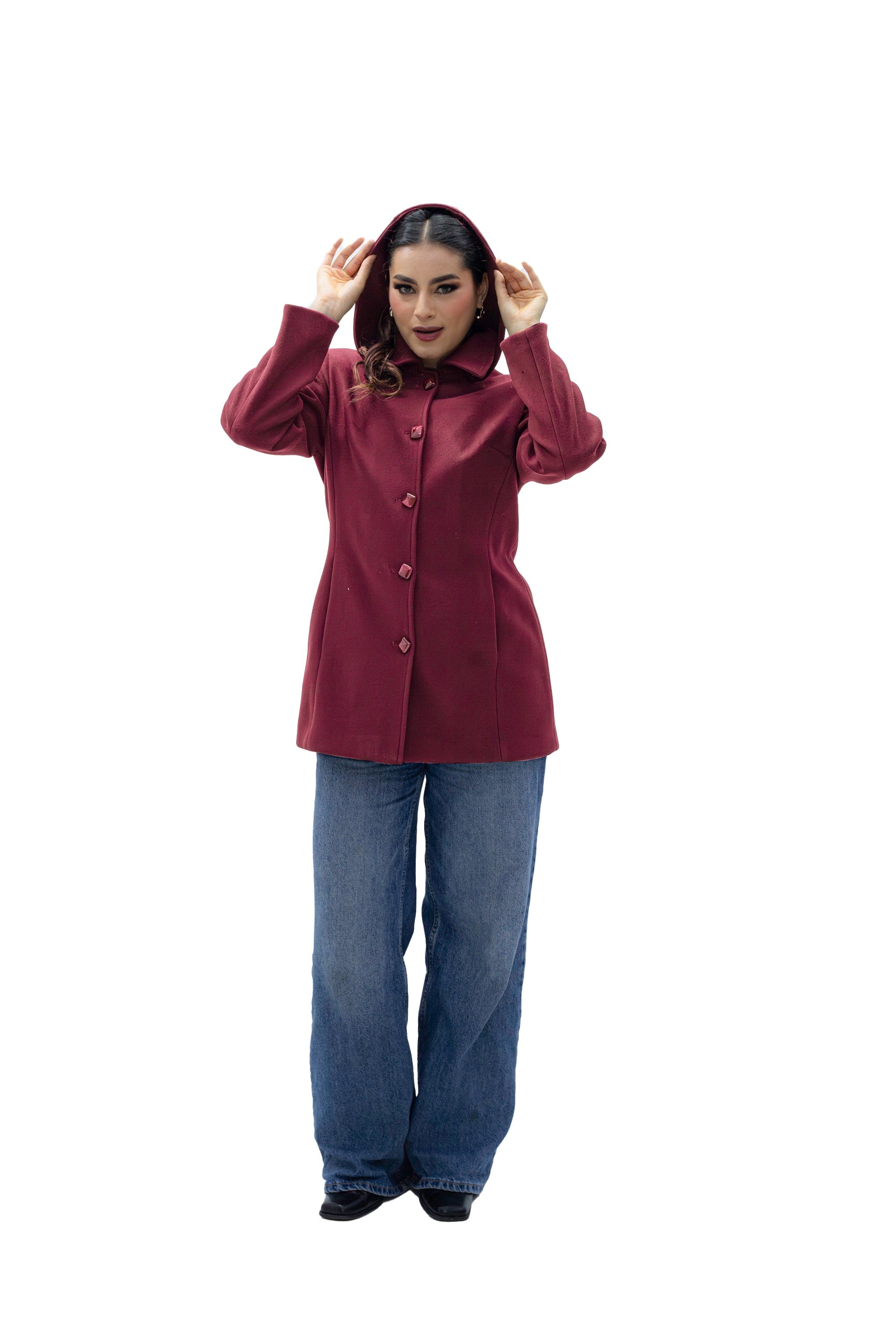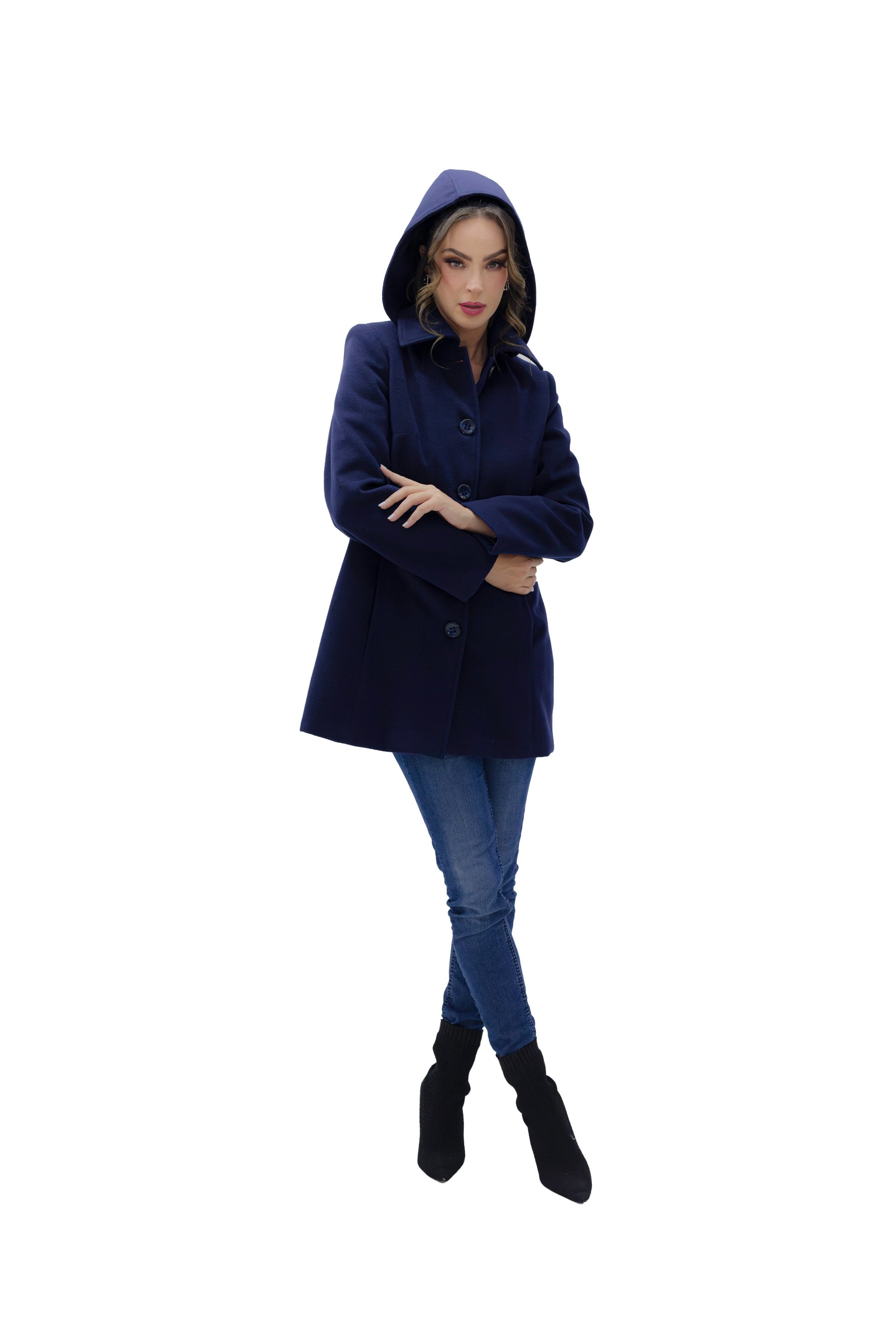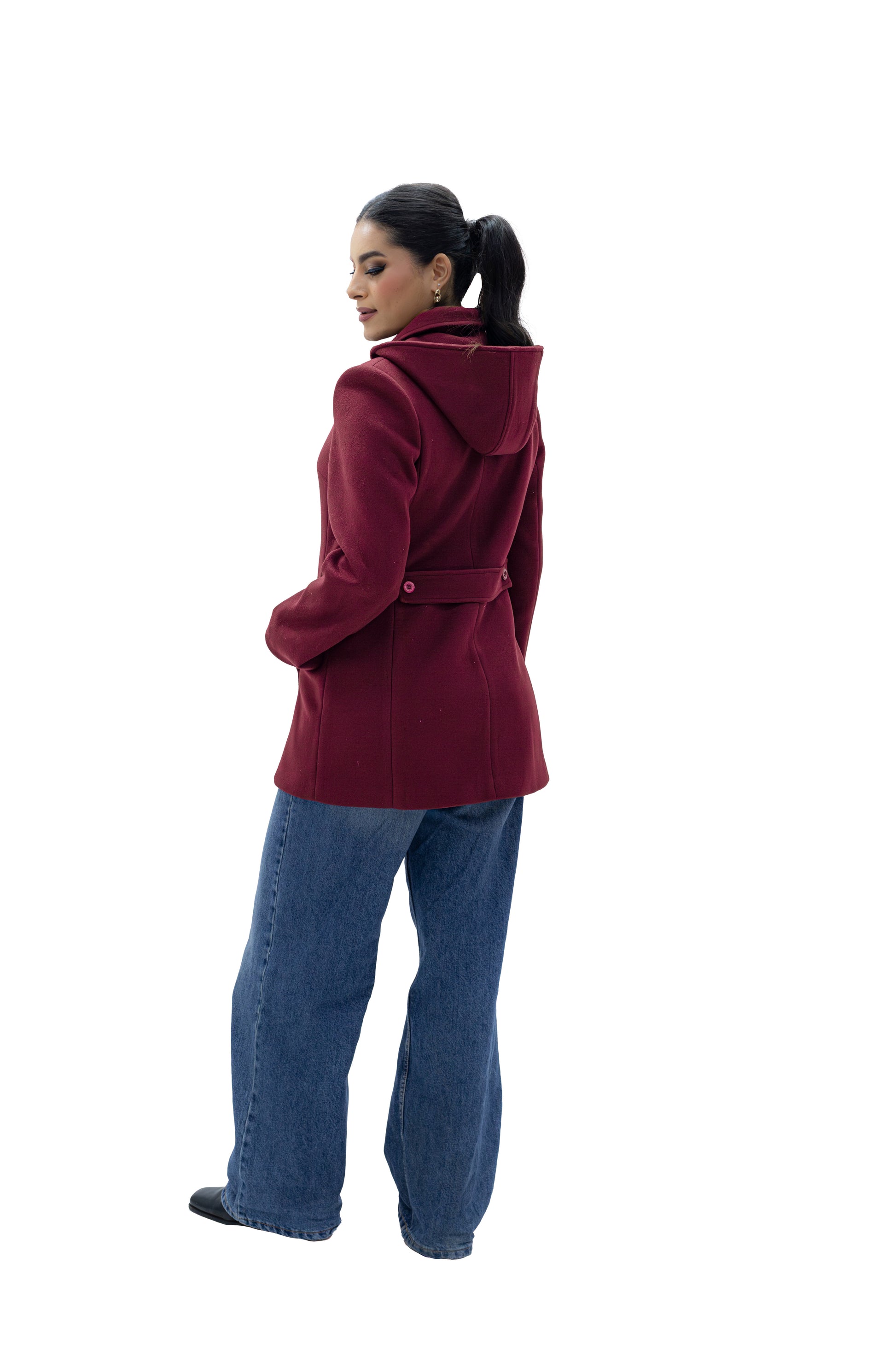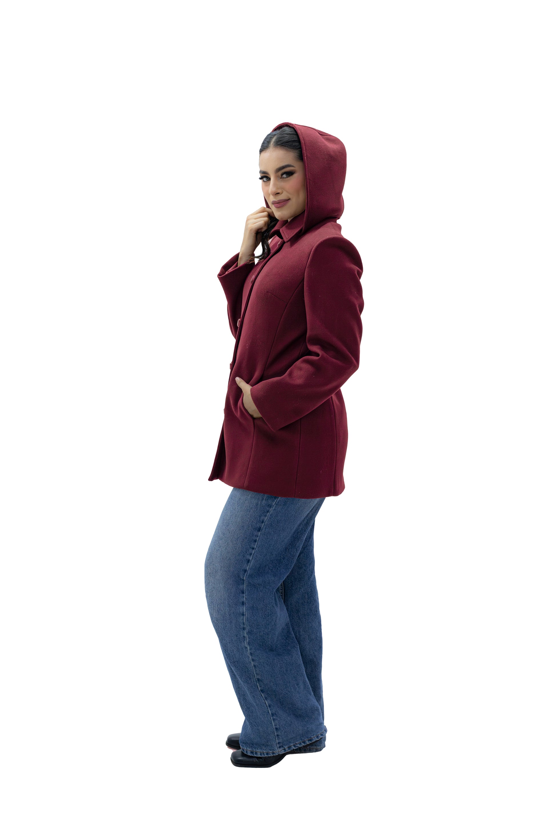 Abrigo de largo medio (cubre hasta la mitad del muslo o un poco más arriba, dependiendo de la altura de la persona), con un corte que parece ligeramente acampanado o de línea A, manga larga con cuello de solapa y capucha, cinta trasera que ayuda a marcar la cintura y dar una forma mas estilizada, se abrocha al frente con botones. Ideal para para el otoño y el invierno.