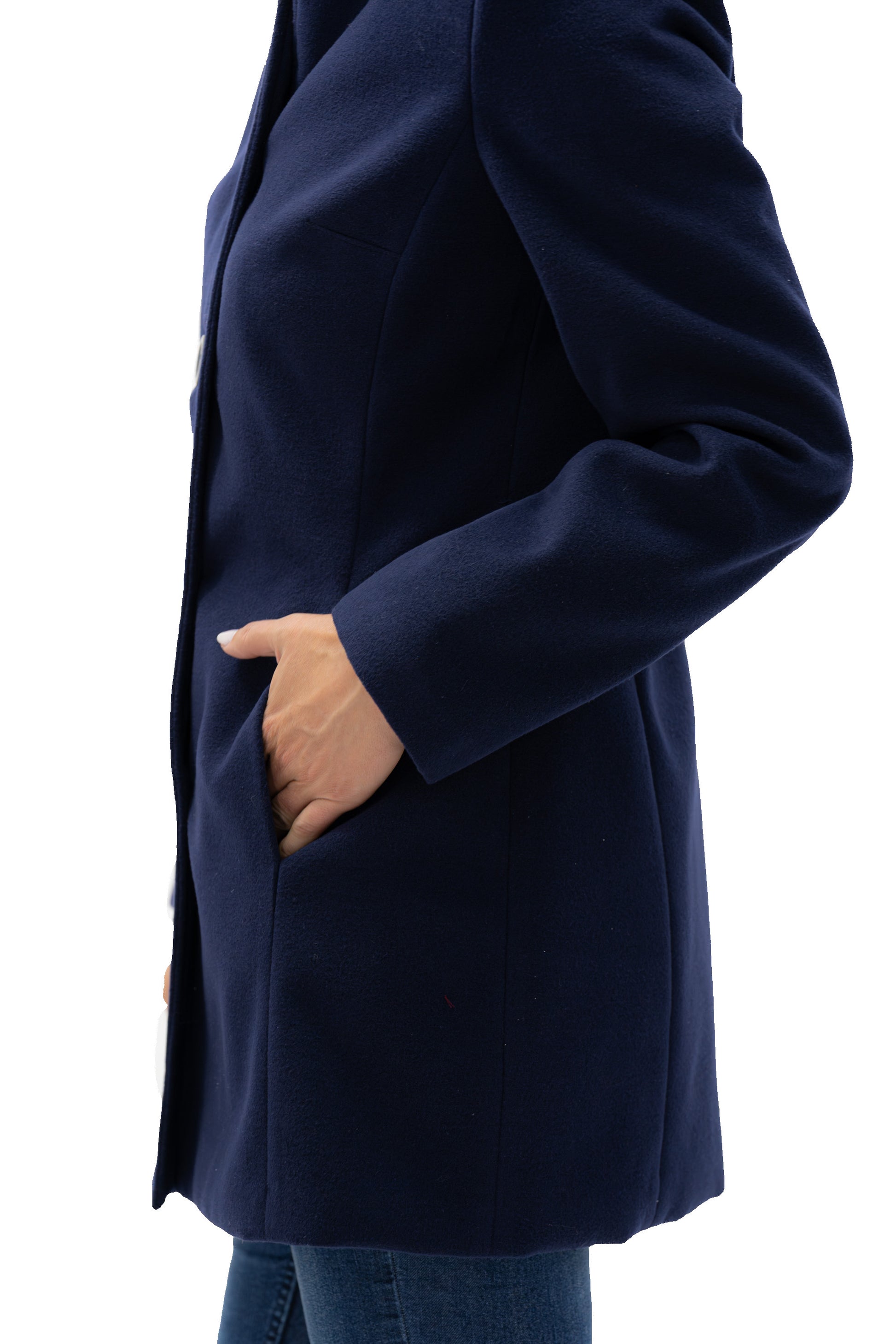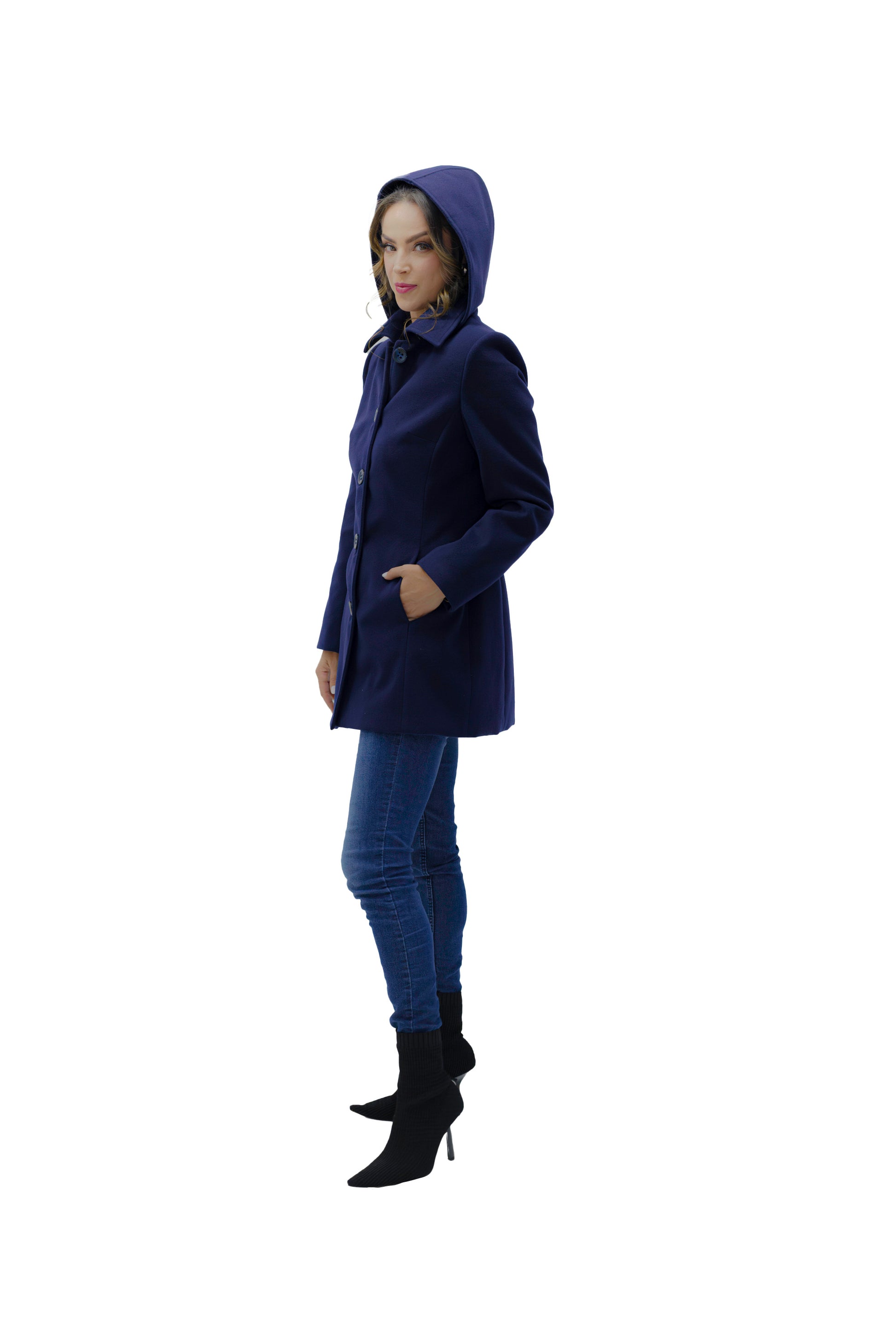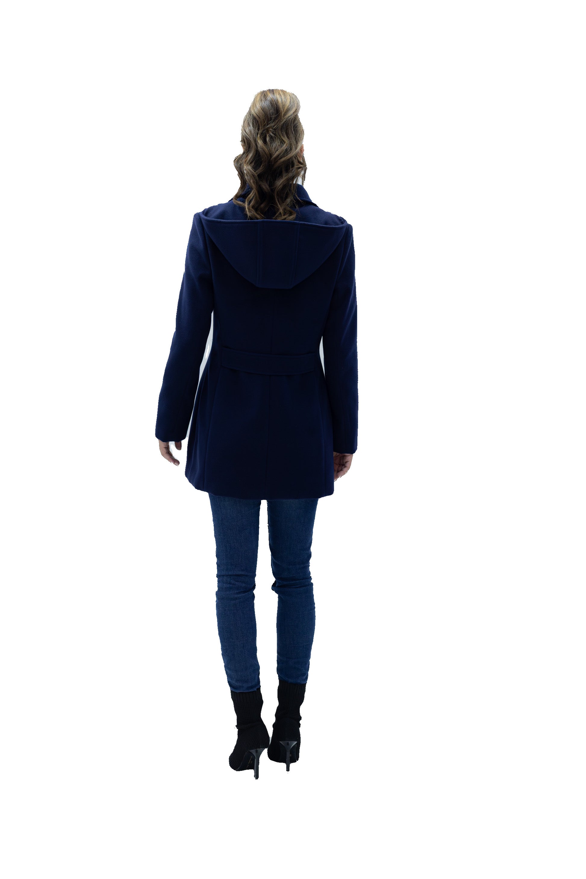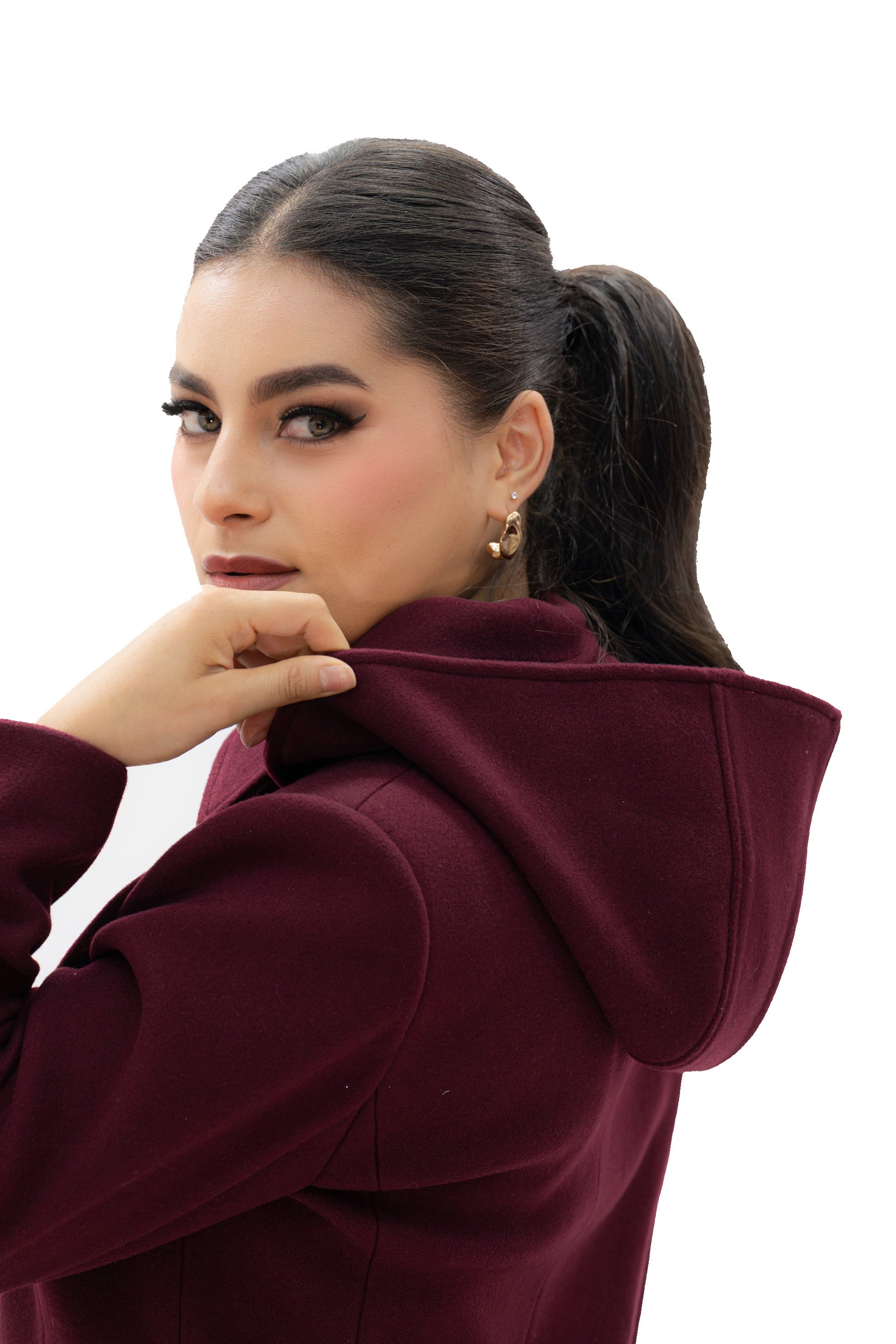 Abrigo de largo medio (cubre hasta la mitad del muslo o un poco más arriba, dependiendo de la altura de la persona), con un corte que parece ligeramente acampanado o de línea A, manga larga con cuello de solapa y capucha, cinta trasera que ayuda a marcar la cintura y dar una forma mas estilizada, se abrocha al frente con botones. Ideal para para el otoño y el invierno.