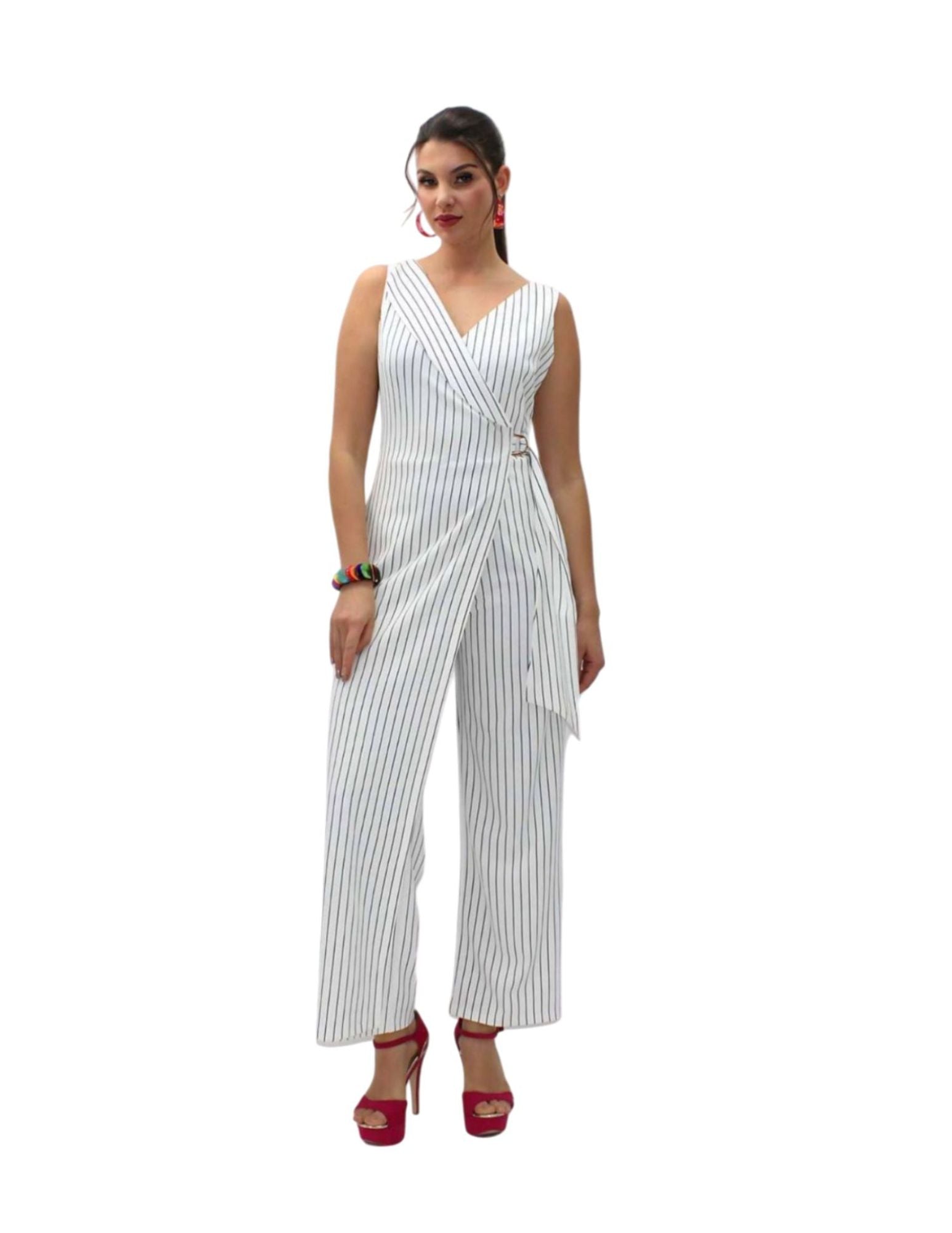 Palazzo a rayas verticales en blanco o negro, que crean un efecto adelgazante , cinturón para marcar mejor la figura con hebilla cosida , cuello en "V" cruzado, sin manga, pierna ancha y tejido ligero. Ideal para cualquier ocasión, el día al día o una reunión formal.