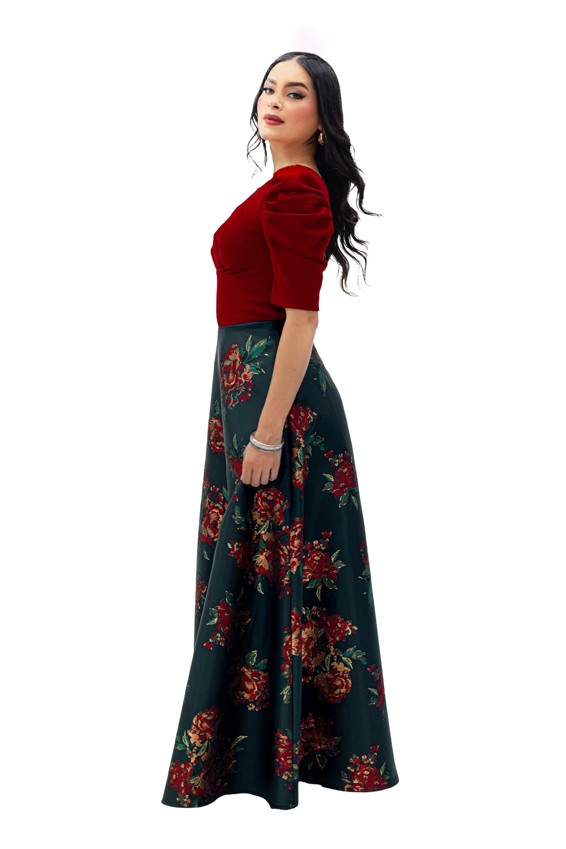 Vestido de fiesta con mangas abullonadas, top rojo y falda tafeta con Print de flores, falda recta A y top cruzado con spandex para mayo comodidad.