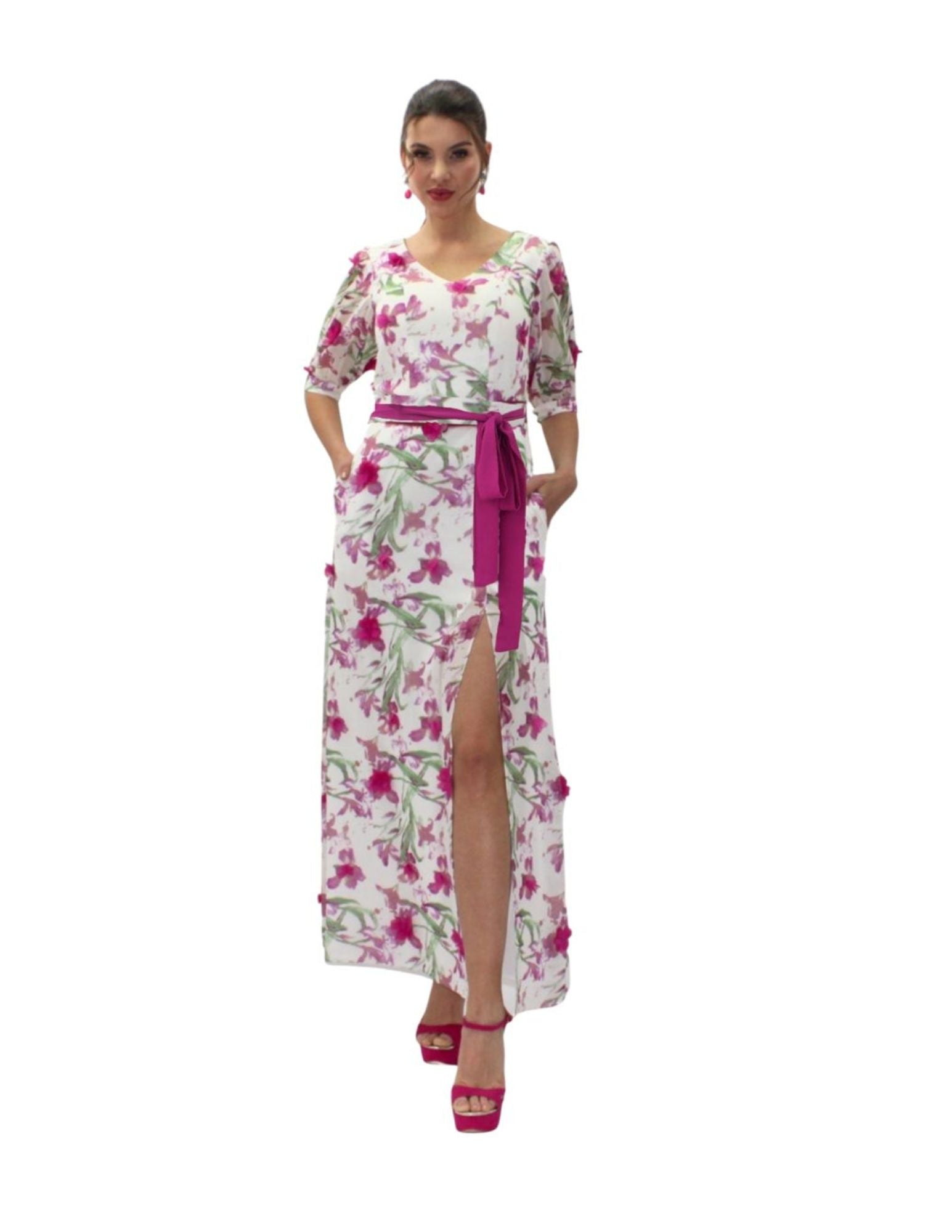 Vestido maxi, blanco con estampado de flores en tonos lila y flores en relieve en tono bugambilia. Cinta ajustable a la altura de la cintura para acentuar la cintura, apertura lateral, de muslo a tobillo, falda fluida. Ideal para bodas de día, bautizos, fiestas o comidas familiares.